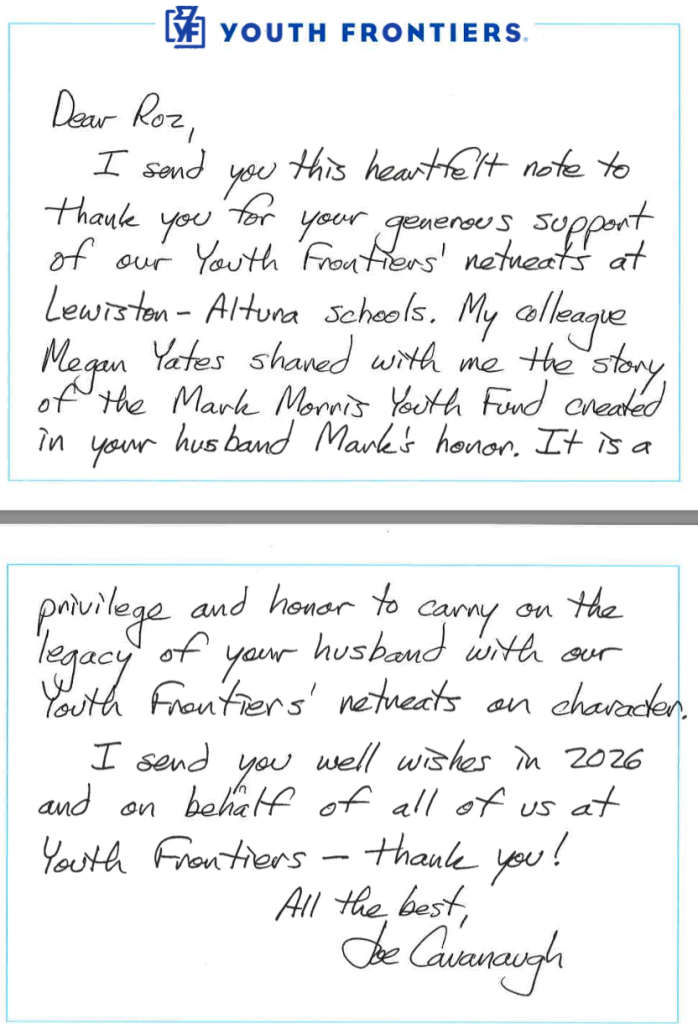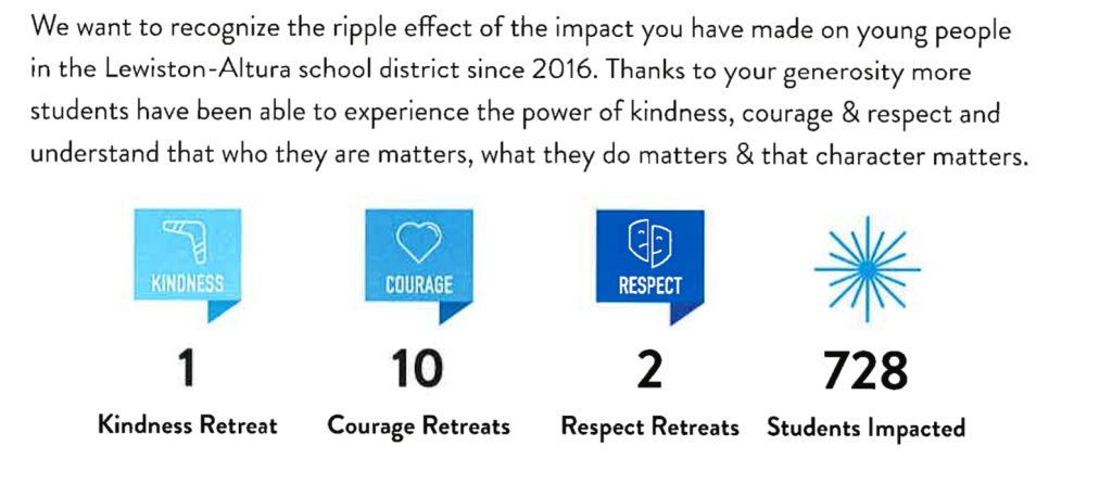 Furthermore, our elementary school students are supported by the Mark Morris Fund, allowing the school to offer enrichment activities such as the Art Club and LEGOs club. Lastly, we continue to support the Courage Retreat and Kindness Retreat – both run by Youth Frontiers and serving the middle school students. To date, these retreats have impacted over 700 students at Lewiston-Altura schools! It’s hard to believe we’ve been doing this for over a decade.